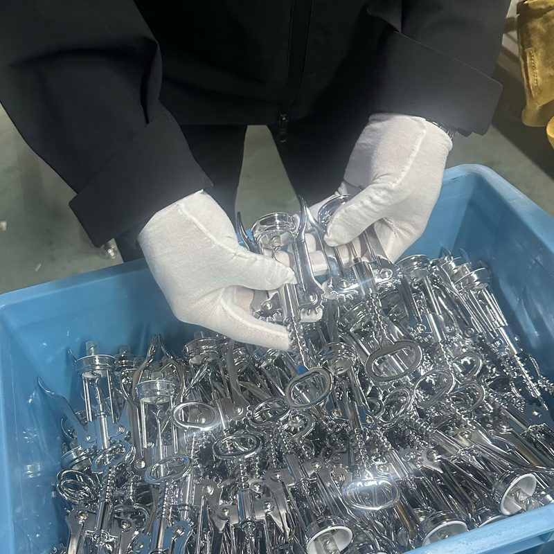 కార్క్స్క్రూ యొక్క అన్ని భాగాలపై పూతలు సాధారణంగా ఎలక్ట్రోప్లేటింగ్ లేదా పెయింటింగ్ పద్ధతులను ఉపయోగిస్తాయి, ఈ ఉదాహరణ కోసం, మేము ఎలక్ట్రోప్లేటింగ్పై దృష్టి పెడతాము. ఎలక్ట్రోప్లేటింగ్ ప్రాసెసింగ్ అవుట్సోర్స్ సరఫరాదారు ద్వారా పూర్తి చేయబడుతుంది, దీనికి చాలా ప్రత్యేక సౌకర్యాలు, పరికరాలు మరియు పరిశ్రమ ఇంజనీర్లు అవసరం 30 సంవత్సరాల పరిశ్రమ అనుభవం ఉన్న సరఫరాదారులతో దీర్ఘకాలిక సహకారం, ఉత్పత్తి స్థిరత్వానికి భరోసా. తయారీ సమయంలో ఎదురయ్యే వివిధ ఉత్పత్తి సమస్యలను త్వరగా, వృత్తిపరంగా మరియు సమర్ధవంతంగా పరిష్కరించవచ్చని కూడా ఇది నిర్ధారిస్తుంది. ఈ ఏర్పాట్లు వైన్ ఉపకరణాలు, కిచెన్వేర్ మరియు కార్క్స్క్రూలు వంటి వస్తువుల ఉత్పత్తి చక్రాలను నిర్ధారించడంలో సహాయపడతాయి, అదే సమయంలో కస్టమర్ల విక్రయ ప్రణాళికలకు కూడా మద్దతు ఇస్తాయి.