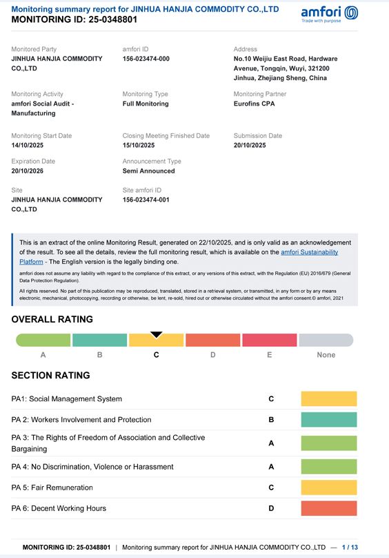 Jinhua Hanjia కమోడిటీ Co., Ltd. దాని BSCI ఆడిట్ ఫలితాలను విడుదల చేసింది. అక్టోబర్ 14న, కంపెనీ ప్రొఫెషనల్ మూల్యాంకనంలో విజయవంతంగా ఉత్తీర్ణత సాధించింది మరియు కస్టమర్ పేర్కొన్న కనీస అవసరాలకు అనుగుణంగా C క్లాస్ సర్టిఫికేషన్ను పొందింది. ఈ ధృవీకరణ యొక్క చెల్లుబాటు వ్యవధి ఒక సంవత్సరం. ఈ ధృవీకరణ యొక్క చెల్లుబాటు వ్యవధి ఒక సంవత్సరం. INBSCI ద్వారా నిర్వహించబడింది. కస్టమర్.ఈ కస్టమర్ చాలా కాలంగా మా కంపెనీ నుండి వైన్ ఓపెనర్లు, వైన్ యాక్సెసరీలు మరియు కాక్టెయిల్ షేకర్ వంటి స్టెయిన్లెస్ స్టీల్ ఉత్పత్తులను కొనుగోలు చేస్తున్నారు. కస్టమర్ యొక్క దేశం ఈ ధృవీకరణను కలిగి ఉండటం సరఫరాదారులకు అవసరం.