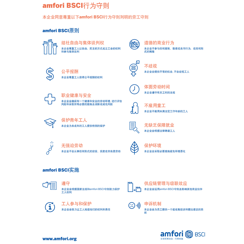 BSCI నిబంధనల యొక్క అవసరాలకు అనుగుణంగా, BSCI సూత్రాలను సమర్థవంతంగా అమలు చేయడానికి మా కంపెనీ Amfori BSCI ప్రవర్తనా నియమావళిలో పేర్కొన్న కార్మిక మార్గదర్శకాలకు ఖచ్చితంగా కట్టుబడి ఉంటుంది. ఉత్పత్తి ప్రక్రియలో, స్వేచ్ఛగా మరియు ప్రజాస్వామ్య పద్ధతిలో యూనియన్లను స్థాపించడానికి మరియు సామూహిక బేరసారాల్లో పాల్గొనడానికి కార్మికుల హక్కులను మేము గౌరవిస్తాము. న్యాయమైన కార్మిక పద్ధతులు మరియు పరిహారం అందుకుంటారు. అదనంగా, కార్మికులకు మంచి పని గంటలు మరియు ఇతర ప్రాథమిక హక్కులు ఉన్నాయని మేము హామీ ఇస్తున్నాము.