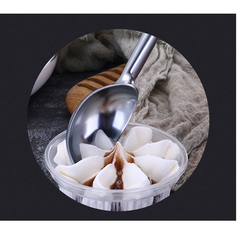 అతుకులు లేని డై-కాస్టింగ్ ద్వారా ప్రీమియం జింక్ మిశ్రమంతో రూపొందించబడిన సౌకర్యవంతమైన గ్రిప్ హ్యాండిల్తో కూడిన ఈ జింక్ అల్లాయ్ ఐస్క్రీం స్కూప్, పదునైన మూలలు లేకుండా సజావుగా ఆకృతి గల అంచులను కలిగి ఉంటుంది, సౌకర్యవంతమైన, గుండ్రని పట్టు అనుభవాన్ని అందిస్తుంది. దాని 16.5 సెం.మీ పొడవు ఉన్నప్పటికీ, స్కూప్ బరువు 75 గ్రాముల వరకు ఉంటుంది. అధిక-ఉష్ణోగ్రతతో కాల్చిన ముగింపు (120°C)తో పూత పూయబడింది, మన్నికైన ఇంకా ఈక-కాంతి నిర్మాణాన్ని సృష్టిస్తుంది. స్కూప్ హెడ్ ప్రత్యేకంగా రూపొందించిన 108-డిగ్రీల బాహ్య-కోణ చిట్కాతో ఓపెన్-బోట్ ఆకారాన్ని స్వీకరించింది, ఇది ఘనీభవించిన ఐస్క్రీం ద్వారా అప్రయత్నంగా ముక్కలు చేస్తుంది. ఉంగరాల, అతుకులు లేని ఐస్ క్రీం విడుదలకు వీలు కల్పించే ఉంగరాల ఉపరితలం. ఈ ఆలోచనాత్మక డిజైన్ నైపుణ్యం స్థాయితో సంబంధం లేకుండా ఎవరికైనా అప్రయత్నంగా ఉపయోగించడాన్ని నిర్ధారిస్తుంది.